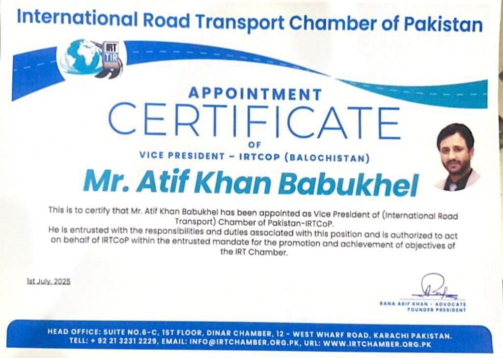 At this occasion MR. Atif Khan Babukhel was appointed “VICE PRESIDENT & Focal Person for BALOCHISTAN CHAPTER OF IRT CHAMBER of Pakistan. Atif Khan Babukhel has to represent IRT Chamber in Balochistan before various Government Authorities, Gwadar Port Authority & other Chamber, Trade Associations of Logistic Tourism Sectors.